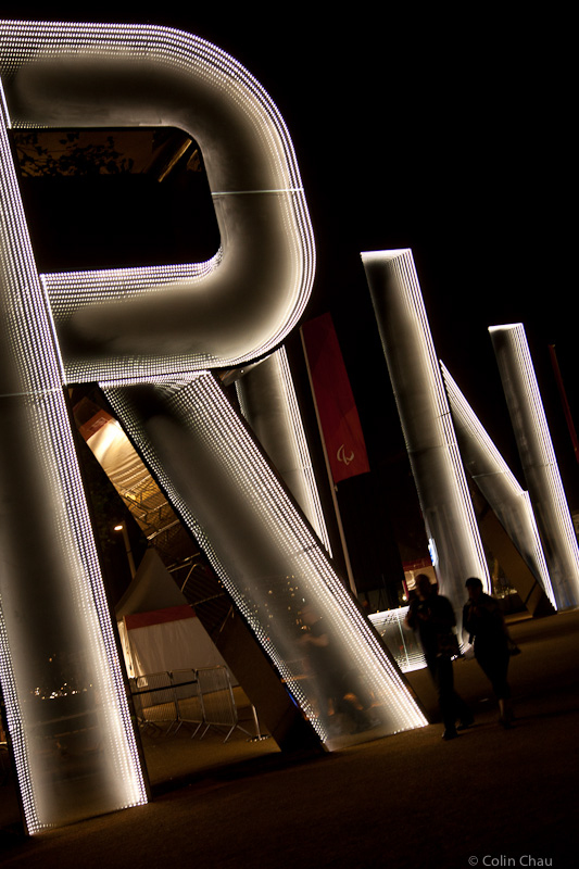 The 30-ft tall “RUN” sculpture outside the CopperBox handball arena. Made of reflective glass and steel, it is on of 26 specially-commissioned art pieces for the Olympic Park.