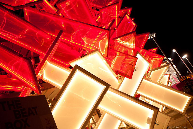 The Beat Box was Coca-Cola’s “interactive pavilion”, part of their music-oriented marketing campaign during the Games to brainwash entertain and educate(?) visitors. Notably, this was probably the only sponsor structure that was not awash with corporate logos.